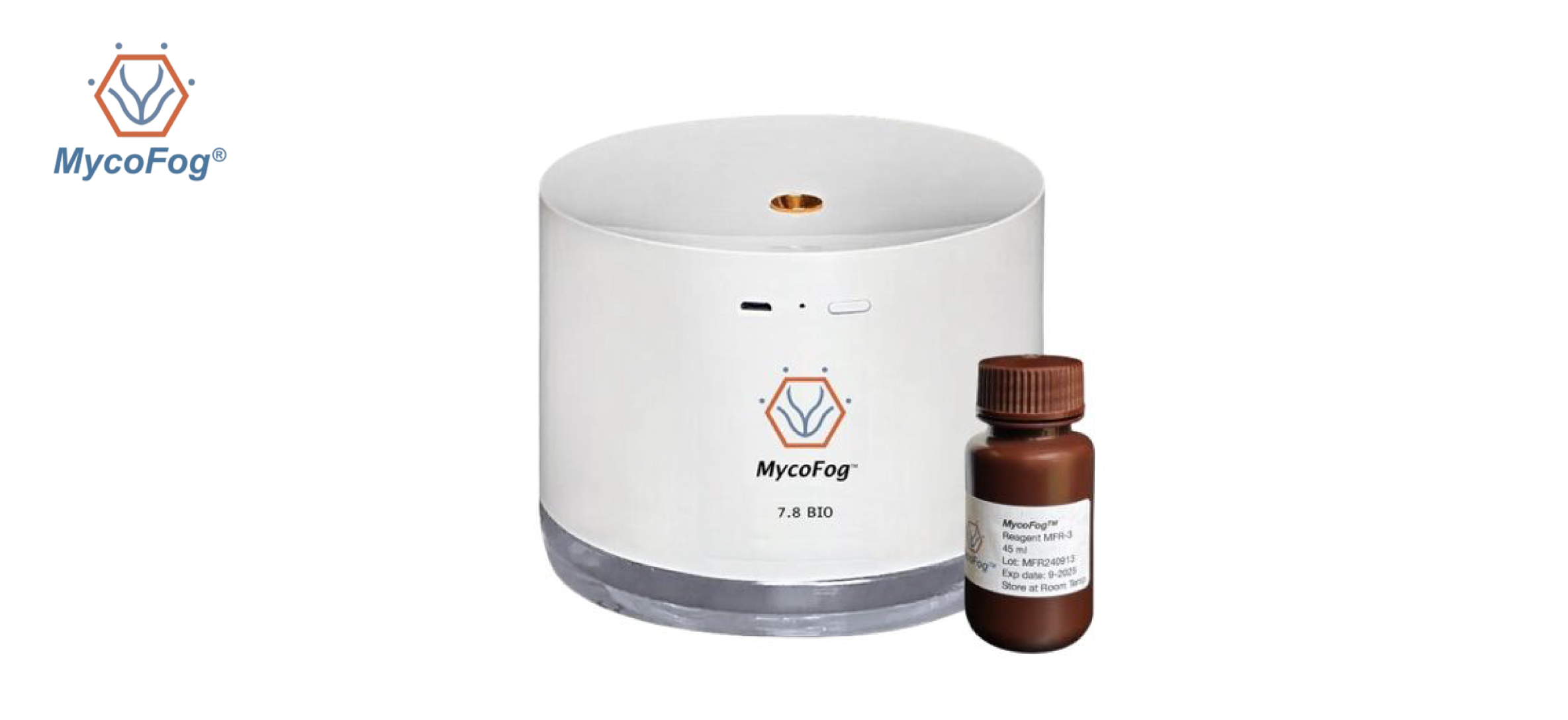 MycoFog® 生物淨化系統由一台可產生過氧化氫霧(氣化過氧化氫,vH₂O₂)的設備(MycoFog®),以及預先包裝、可直接使用的過氧化氫試劑瓶所組成。MycoFog® 可協助培養箱使用者快速、簡便且有效地去除培養箱內所有可能影響實驗結果的生物性污染物。